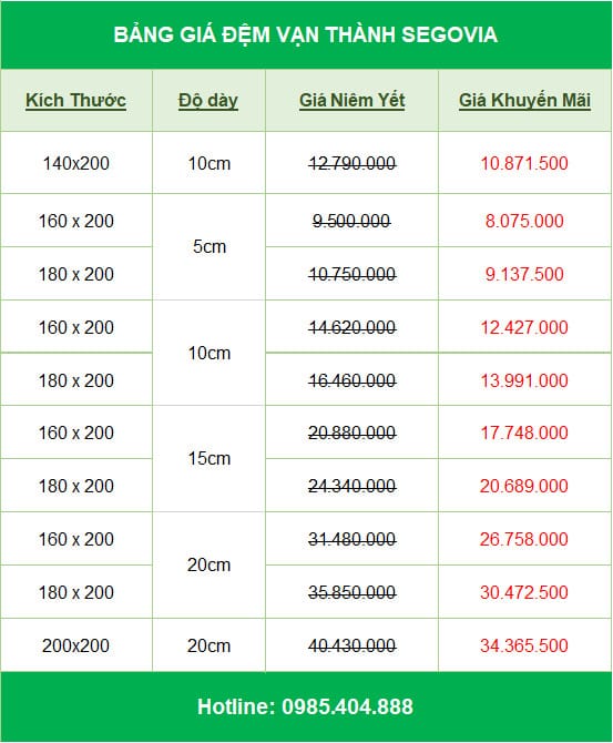 Với mức giá chỉ còn từ hơn 7 triệu trong đợt khuyến mãi duy nhất trong tuần này tại Vanthanhhanoi.vn. Sẽ là một sự lựa chọn thông minh khi mua đệm cao su Vạn Thành Segovia nếu xét cả về chất lượng lẫn độ bền.